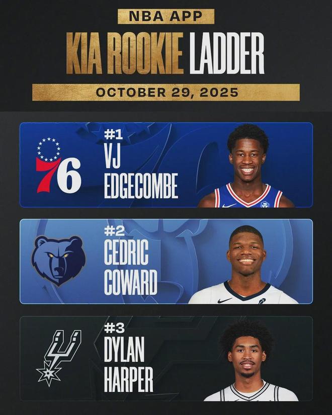 灰熊11号秀考沃德场均16分3.8篮板2助攻1抢断,三项命中率;65.1%,64.7%,92.9%。高居新秀榜第二,仅次于埃奇库姆。马刺榜眼迪伦-哈珀场均14.8分5.3篮板4.8助攻1抢断,三项命中率:47.8%,33.3%,85.7%。
