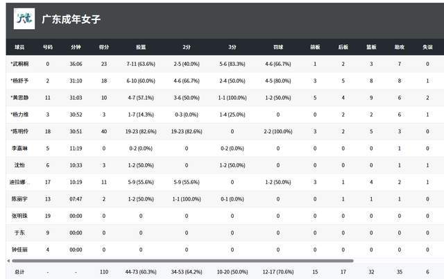 陈明伶真是被打通了任督二脉了,跟着宫鲁鸣训练过就是不一样,此役,她出战30分钟,23投19中,2罚2中,独砍40分5篮板3助攻,真是太猛了。武桐桐也有上佳表现,11投7中,拿到23分3篮板7助攻。