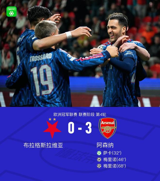 北京时间11月5日1:45,欧冠联赛阶段第4轮,阿森纳作客挑战布拉格斯拉维亚,本场主裁判为阿加耶夫。上半场,萨卡点射建功。下半场,梅里诺连下两城梅开二度。最终,阿森纳客场3-0击败布拉格斯拉维亚。